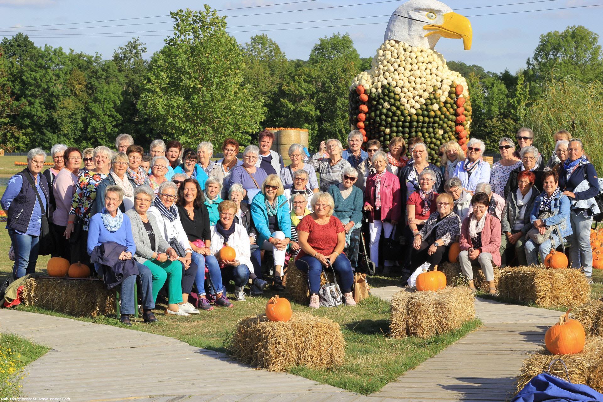 Ein relaxter Tag nur für Frauen! Mehr als fünfzig reiselustige Damen hatten sich auf diesen Tag in netter Gemeinschaft gefreut und waren der Einladung der kfd Arnold-Janssen zum Jahresausflug gefolgt. Nach kurzem Reisesegen an der Arnold-Janssen-Kirche durch Pater Hans Peters startete man bei noch etwas frischem Wetter mit dem Bus in Richtung Bad Münstereifel, das auch als „Tor zur Eifel“ bezeichnet wird. Aufgeteilt in drei Gruppen wurde die historische Altstadt mit fast komplett erhaltener Stadtmauer und malerischen Fachwerkhäusern besichtigt. Sogar einige Gemeinsamkeiten mit der Stadt Goch wurden festgestellt. Es gibt- wie früher in Goch - vier Stadttore, die dort jedoch alle noch erhalten sind und für Dauer-Ausstellungen, als Vereinsheim und für „Torwächter-Führungen“ als Gast- und Vortragsraum genutzt werden. Ebenfalls wie Goch machte sich Bad Münstereifel durch die Tuchindustrie einen Namen. Nach viel Wissenswertem über diese hübsche Stadt blieb noch Zeit für eigene Erkundungen, bevor der Bus weiter nach Mechernich zum „Krewelshof“ fuhr. Im Bus gab es allerlei Informationen über die dort unter dem Thema „Flügel und Beflügeltes“ stattfindende Kürbisschau. Frei nach Lust und Laune konnten dort die kunstvollen Kürbisfiguren bewundert und für die Daheimgebliebenen fotografiert werden. Nach Kaffee und Kuchen wurde die Heimreise zu „Jan an de Fähr“ in Goch angetreten, wo der Tag für viele bei einem gemeinsamen Abendessen gemütlich ausklingen konnte.