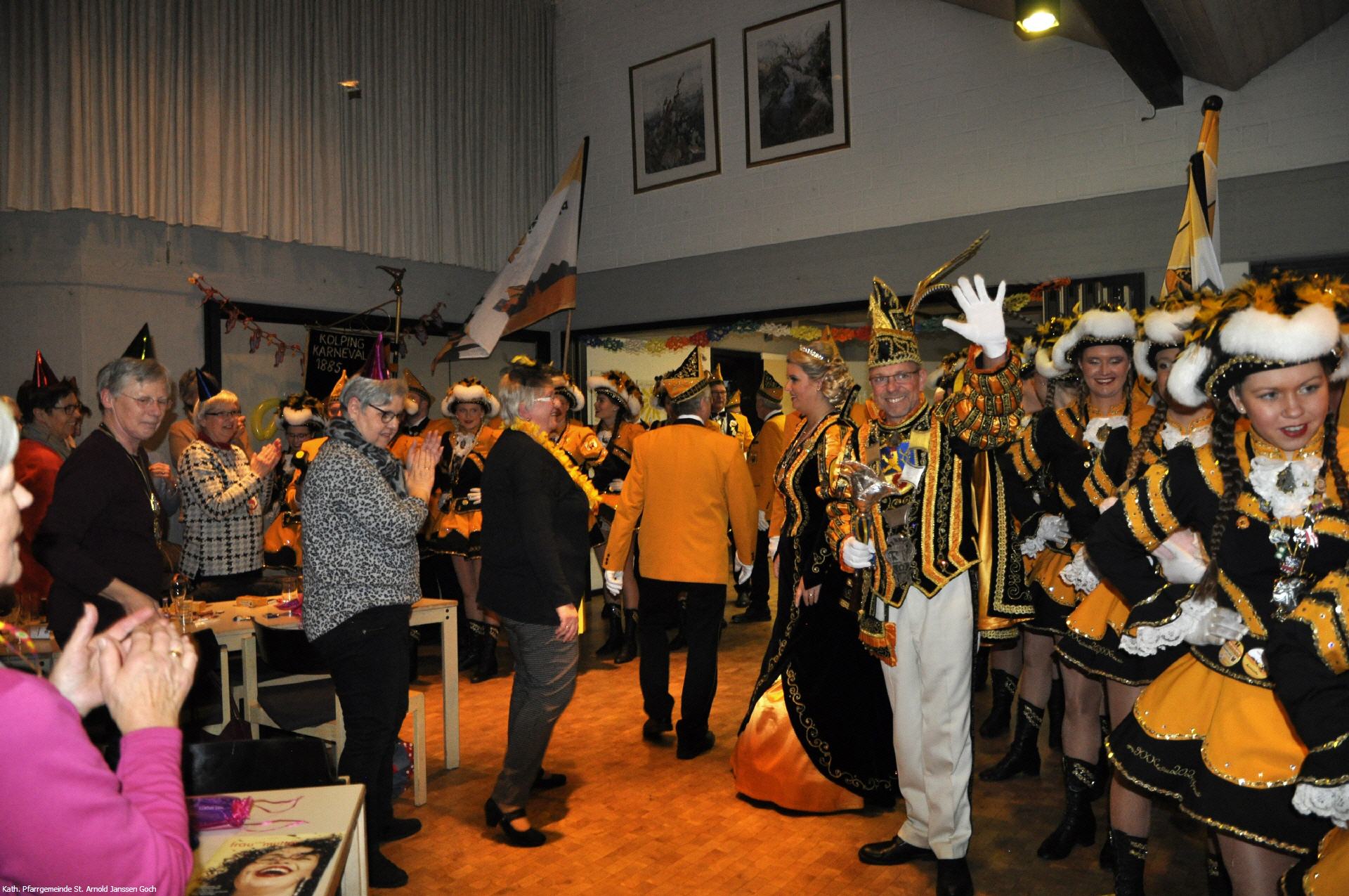Nach dem Gottesdienst waren alle Frauen zu einer karnevalistischen Stunde ins bunt geschmückte Pfarrheim eingeladen. Zunächst wurde sich bei Karnevalsmusik, Kaffee und Berliner Ballen, Sekt und Pfläumchen gestärkt, bevor Christa Welbers mit einem Koffer voller Erinnerungen draußen stand. „Solle mer se reinlasse?“ Die Begrüßung mit einem kräftigen „HELAU“ erwies sich als gute Entscheidung, denn was die künftige Teilnehmerin des „Urlaub ohne Kofferpacken“ da aus ihrer Handtasche und dem Koffer hervorzauberte, weckte bei den Zuhörerinnen Erinnerungen an vergangene Zeiten. Völlig frei, ohne schriftliches Konzept und auf „Gochs Platt“ präsentierte Christa Welbers locker und total entspannt einen Vortrag, der die Lachmuskeln arg strapazierte. Schunkelmusik und einige kleinere Vorträge reihten sich an, bis es hieß: „De Prinz kütt!“ Mit Tambourcorps und Garde ließen es sich Prinz Johannes und Prinzessin Julia nicht nehmen, auch diese recht kleine Veranstaltung mit ihrem Frohsinn anzustecken. Bunt gemischte Reihen durch „Schwarz-Gelb“ sangen und schunkelten zur Musik des Gocher Heimatliedes. Nachdem Angelika Janßen die Tollitäten mit dem kfd-Orden ausgezeichnet hatte, empfing auch sie selbst für ihre unermüdlichen Verdienste die Orden des Prinzenpaares und sagte die Unterstützung der kfd-Frauen beim närrischen Treiben in den nächsten Wochen zu.