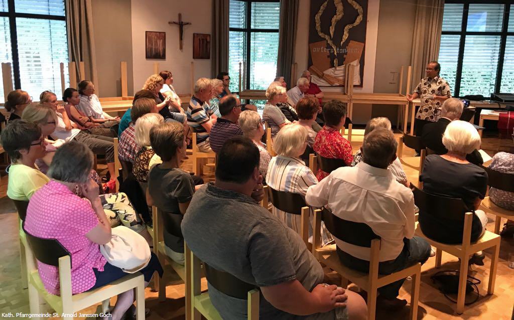 Angenehm überrascht waren die zahlreichen Besucher, die zur von der Bücherei Liebfrauen organisierten Lesung ins Pfarrheim Arnold-Janssen, Goch, gekommen waren. Der Steyler Pater Devis Don Wadin aus St. Augustin hatte nicht nur sein Buch an diesem Abend mitgebracht, sondern auch einige stimmgewaltige indonesische Freunde. Begleitet auf der Gitarre u.a. vom Gocher Kaplan Agateus Ngala und beim Gesang vom Gocher Krankenhauspfarrer Willi Jacobs, der viele Jahre auf der indonesischen Insel Timor gelebt hat, trug die Gruppe den Besuchern einige traditionelle Lieder aus der Heimat vor. „Musik kennt keine Grenzen“, der Abend begann schon in angenehmer und lockerer Atmosphäre, bevor Pater Devis mit anschaulichen Bildern Landschaft und Kultur einiger indonesischer Inseln und sich selber vorstellte. Beeindruckende, aufbauende Texte und Gedanken aus seinem Buch animierten viele Gäste, sein Buch „Eine Kokosnuss im weiten Meer“ zu kaufen und mit dem Erlös und zahlreichen Spenden die Arbeit der Steyler Mission zu unterstützen. Ein herzliches Dankeschön von Pater Devis beendete den rundum gelungenen Abend!
