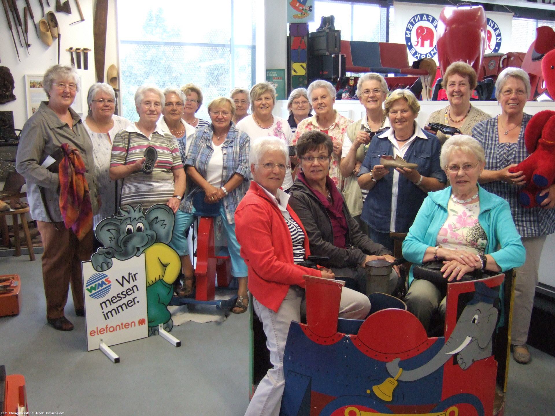 Im Juli waren die Mitarbeiterinnen der kfd St. Maria Magdalena Goch zu einem kleinen Ausflug mit dem Fahrrad oder Auto eingeladen. Dieser war ein Dank für die geleistete Arbeit des ganzen Jahres. Der Tag begann mit einem guten Frühstück in Kessel. Dann ging es weiter über Materborn nach Kleve. Dort wurde das Schuhmuseum der ehemaligen Firma „Elefanten Schuh Hoffmann“ besucht. Die beiden Herren im Museum vermittelten sehr eindrucksvoll den ganzen Werdegang der Firma, von Anfang bis zur Schließung. An Hand der alten Bilder, Maschinen, Werkzeuge, Materialien und fertigen Produkten wurde man in die Vergangenheit versetzt. Es war für alle Frauen sehr interessant. Zum Schluss ging es über Nierswalde mit leckerem Kaffee und Kuchen froh gelaunt wieder nach Goch zurück.